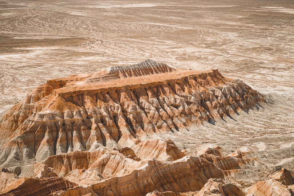 Yangi-Kala Canyon, whose name translates from Turkmen as 'fiery fortresses,' is one of the most spectacular natural wonders of Turkmenistan. Located in the remote northwest of the country, this dramatic landscape features towering cliffs painted in vivid shades of red, orange, beige, and purple—shaped by millions of years of wind and erosion. At sunrise and sunset, the canyon glows with fiery colors, creating an almost surreal atmosphere that has fascinated travelers, photographers, and adventurers alike.